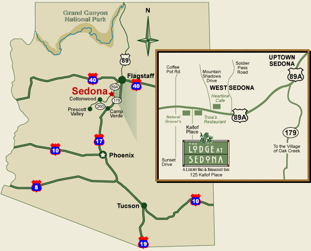 Coming from Phoenix or Hwy 17, the very best way to travel to Sedona is via Hwy 260 West exiting at Camp Verde, through to Cottonwood and then North to Sedona via Hwy 89A. From Phoenix Airport: Exit the Airport at the 24th St. exit and continue to the entrance to Highway 17 north toward Flagstaff. Take 17 north to Hwy 260 (exit 287) make a left turn over the highway and continue west to highway 89A. Right on 89A for 16 miles.We are on the right side of the road as you enter West Sedona. The Lodge at Sedona is located at the end of Kallof Place in West Sedona, just east of Walgreens Drugs. Kallof Place is directly south off Hwy. 89A. We are one block west of Mountain Shadows Drive and one block east of Coffee Pot Road / Sunset Drive.